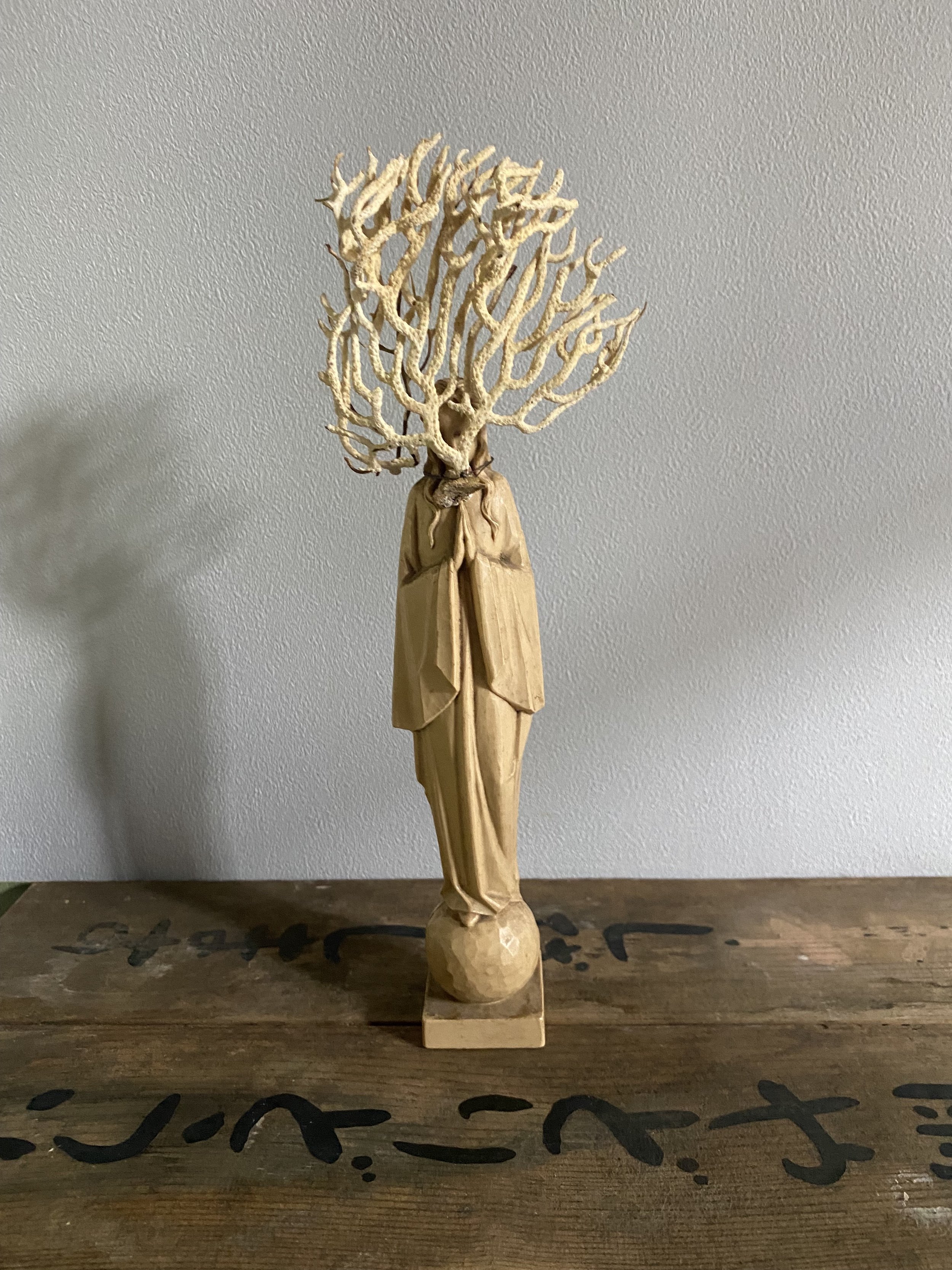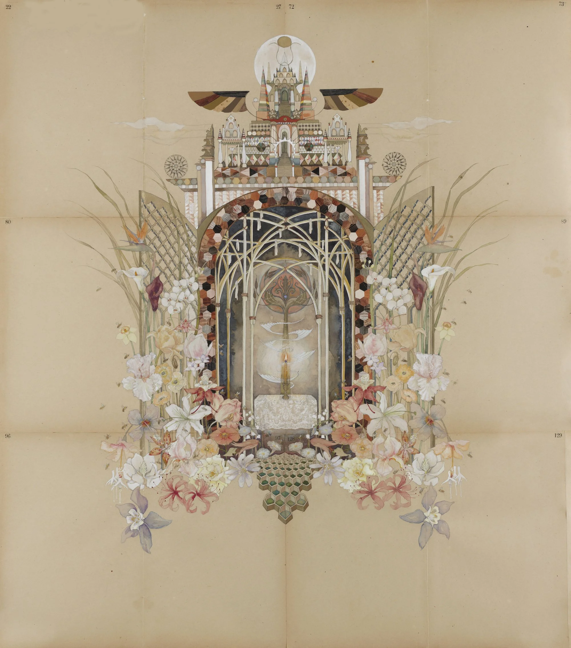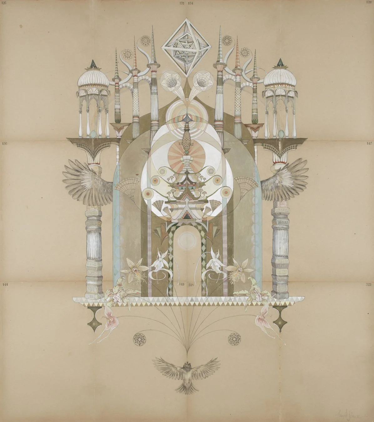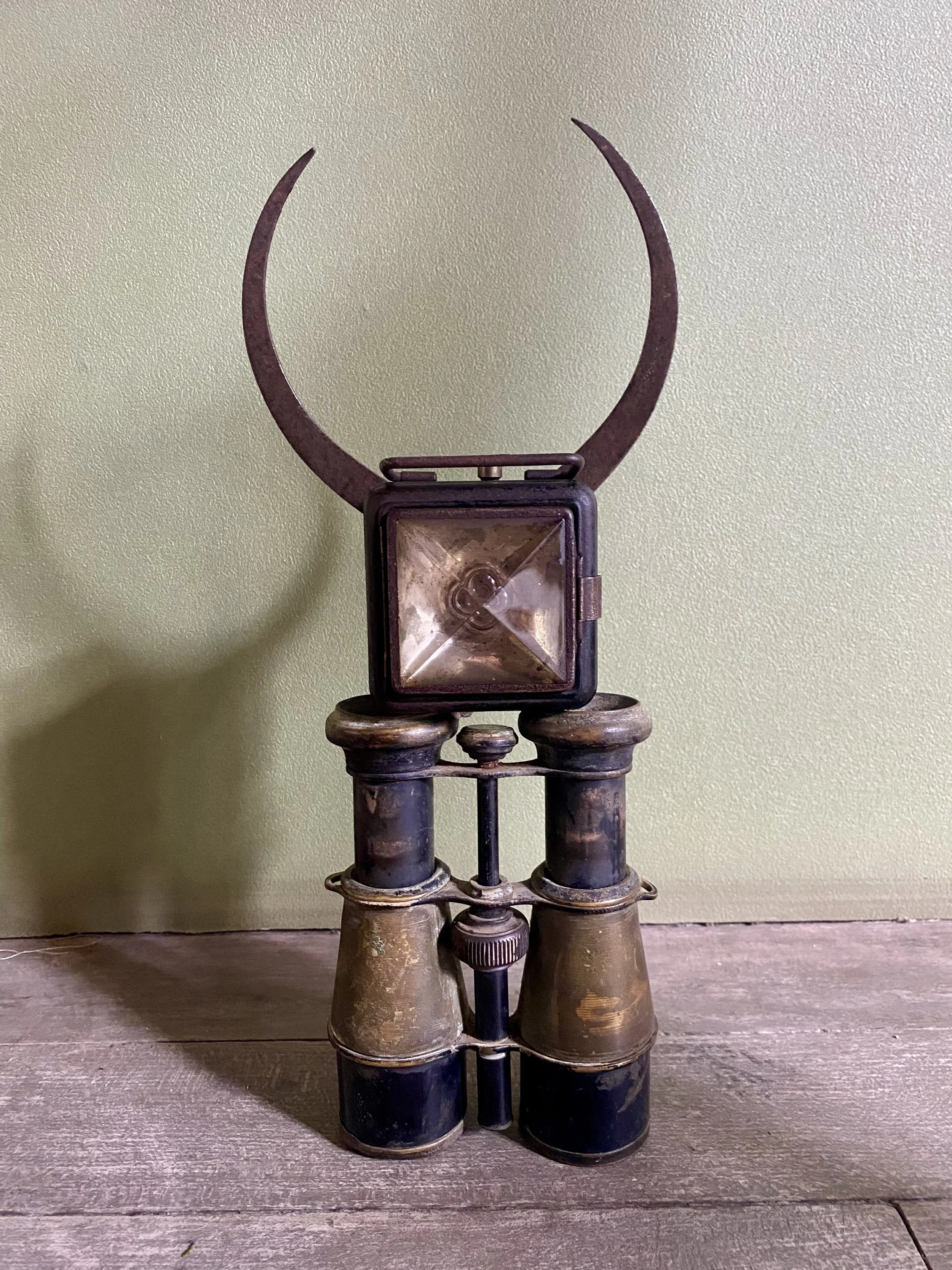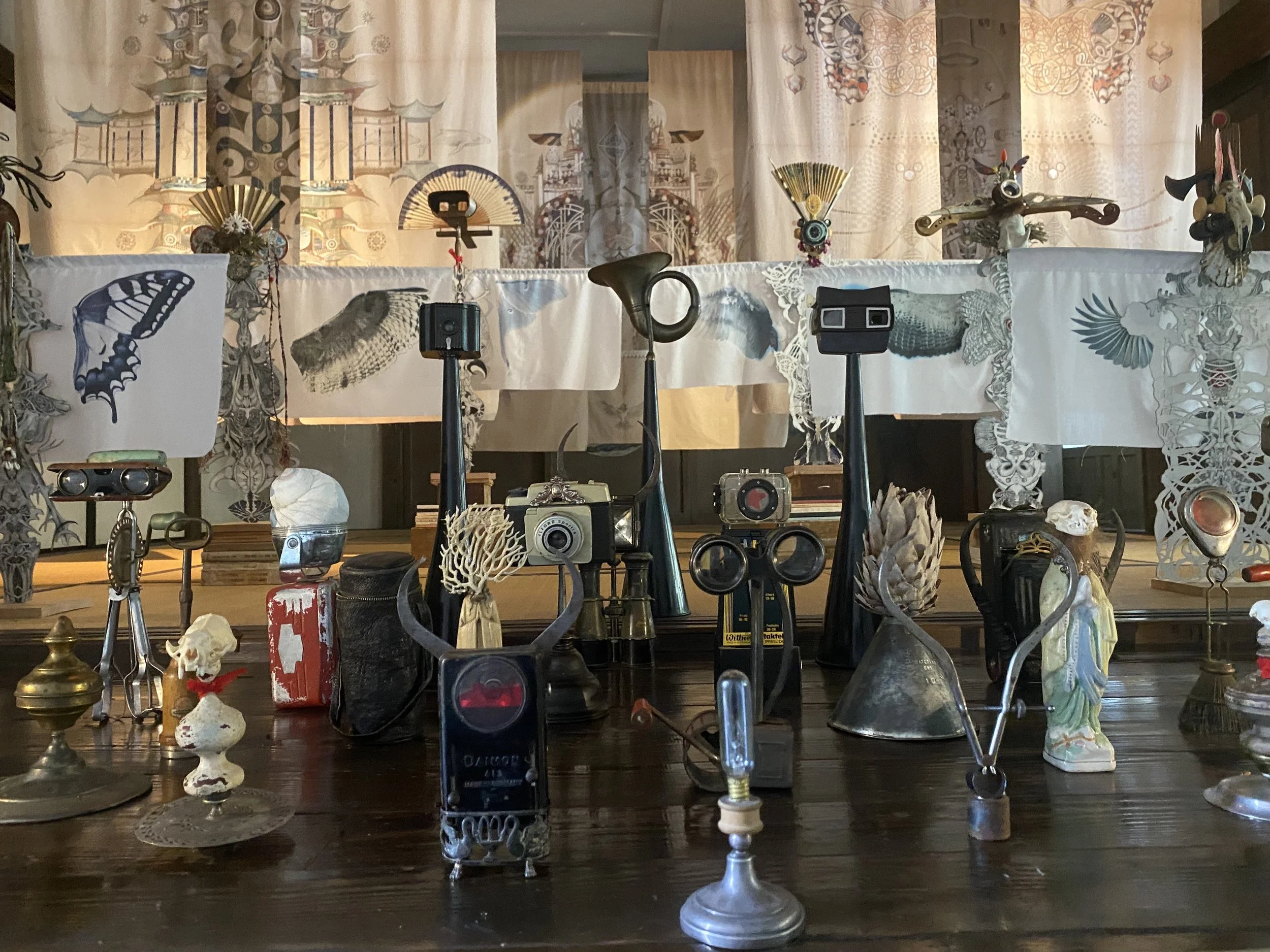 Within this gently moving space, anthropomorphic figures called Hierophants and Gate Keepers gather for the ceremony. They are assembled from papercuts, masks, printed fabrics, and constellations of natural and found materials—old camera parts, lenses, binoculars. These ocular elements function as metaphors for perception and awareness: the act of seeing, and the awareness of awareness itself. The Hierophants symbolize the keepers of the esoteric wisdom and guide the seeker into the ceremony.