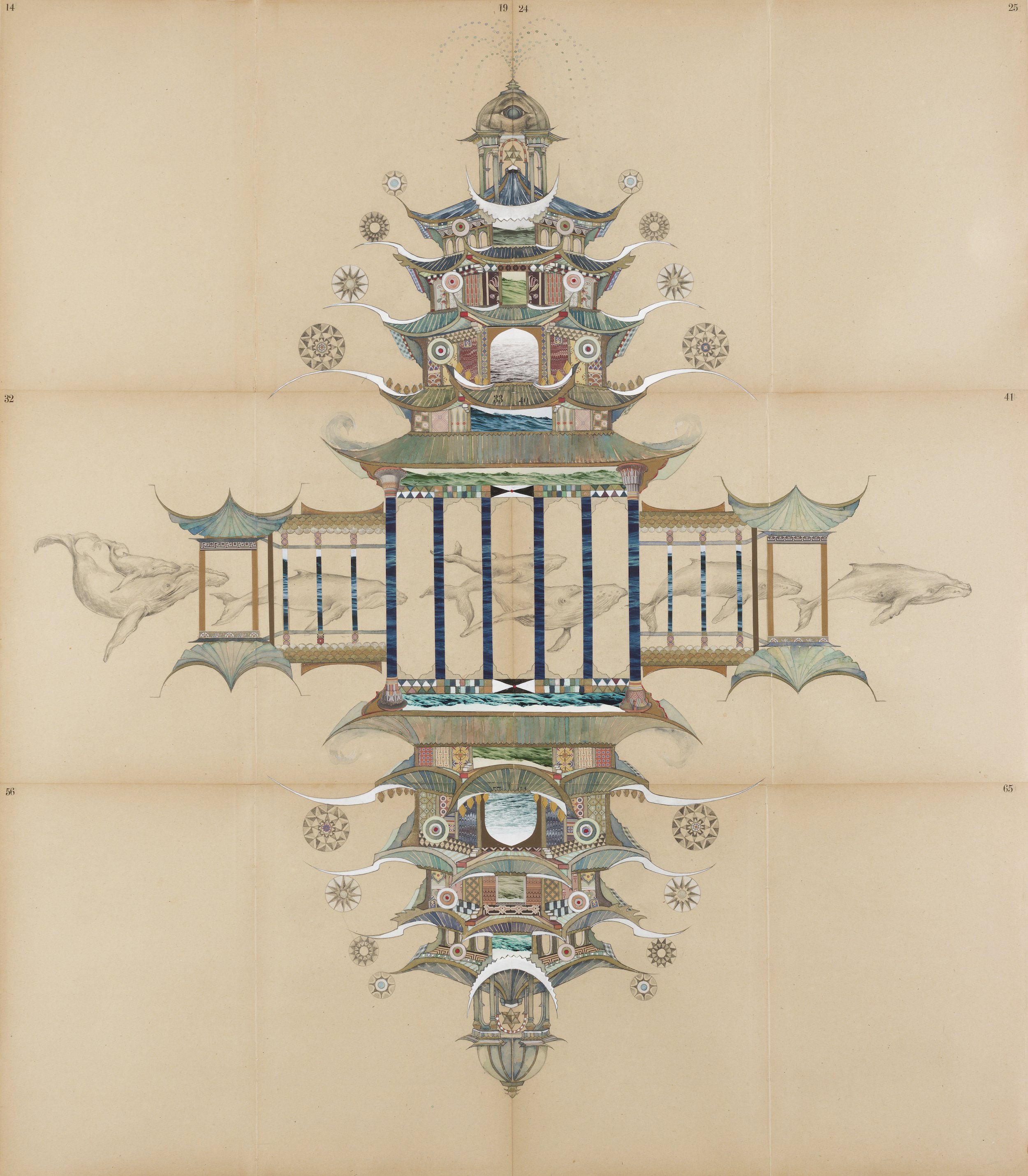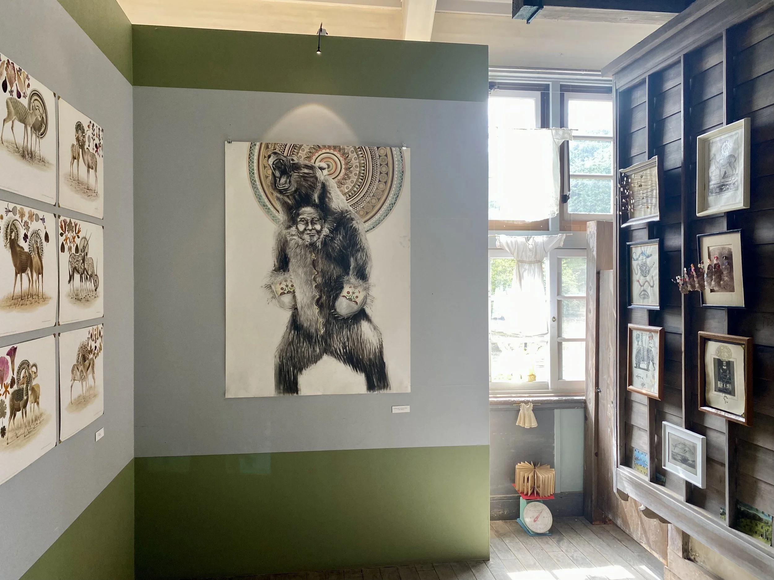 The work unfolds as a ritual environment, framed by gently moving cloth printed with Shrine-images dedicated to Bee, Songbird, and Whale. The sound currents created by these beings, is, I believe, intrinsic to the sonic field of vibration that sews the worlds together.
